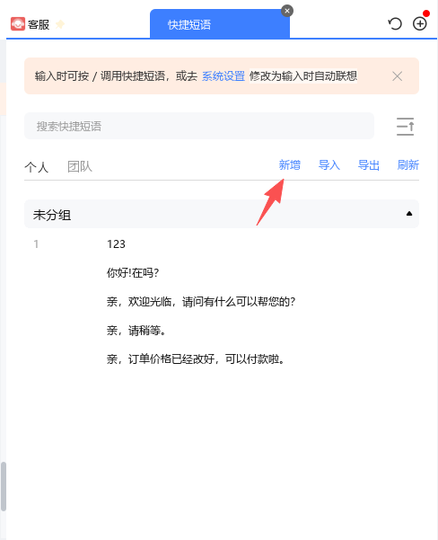 2.然后在《千牛》软件右边会看到快捷短语设置页面,再点击新增按钮,如下图: