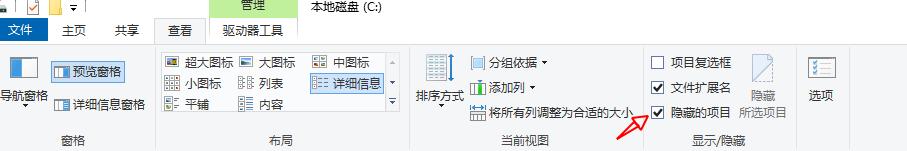 打开本地磁盘(C:)后,切换到 “查看” 选项卡,在 “显示 / 隐藏” 区域,勾选 “隐藏的项目”,这样原本隐藏的文件或文件夹就会显示出来,方便后续操作。